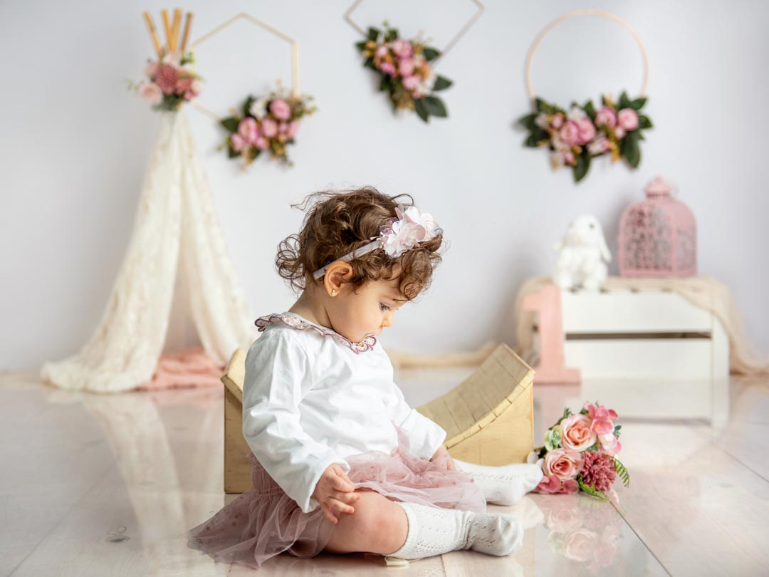 Antes de la sesión, su madre me envió algunos ejemplos de lo que le gustaba. A partir de ahí, tomé varias ideas como inspiración y las adapté al estilo que la mamá buscaba. El objetivo era claro: crear un ambiente bonito, limpio, con flores…