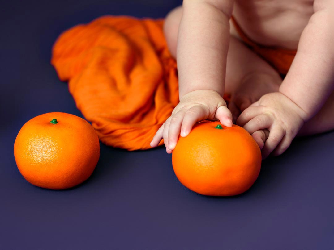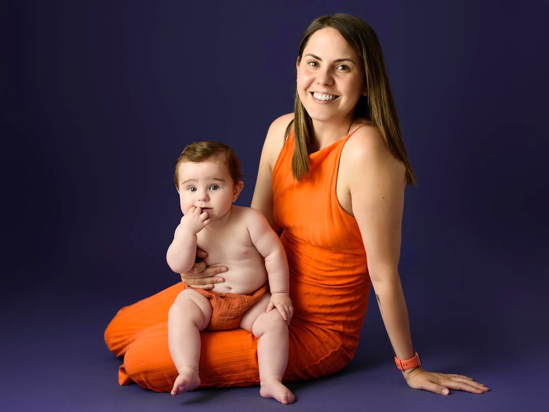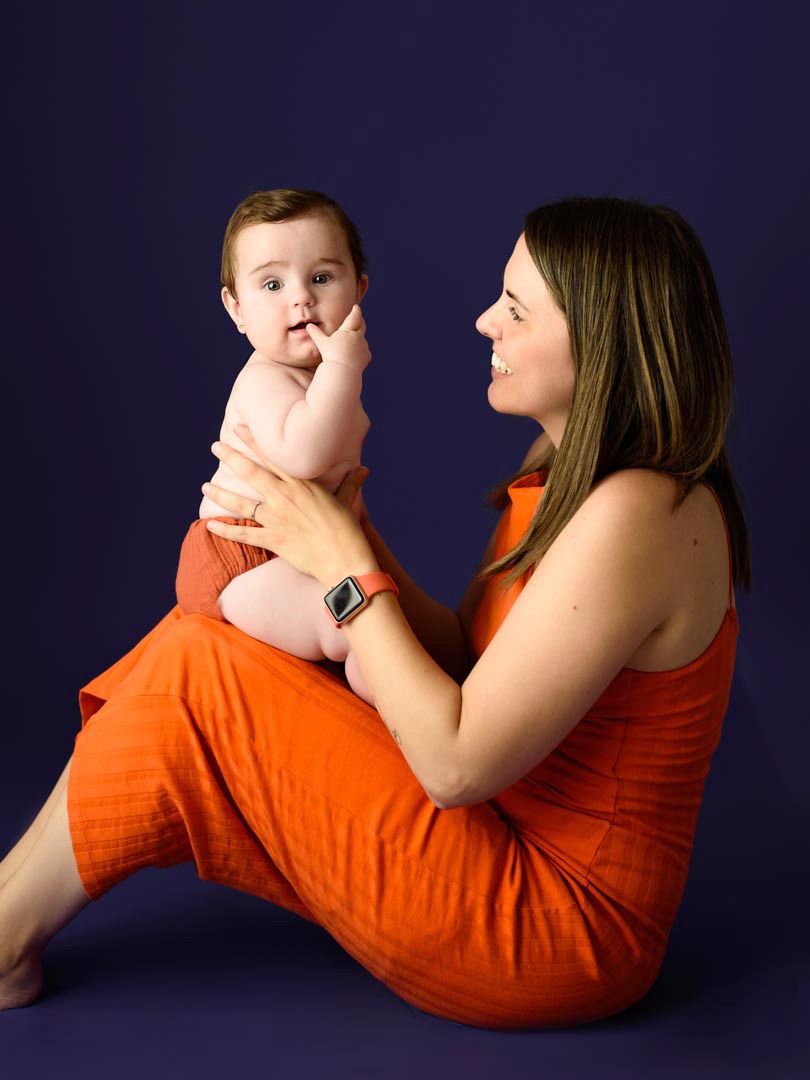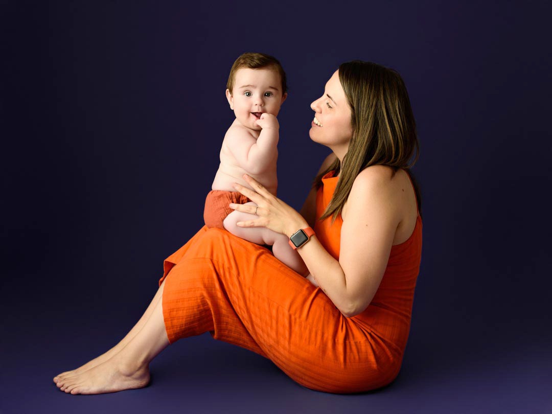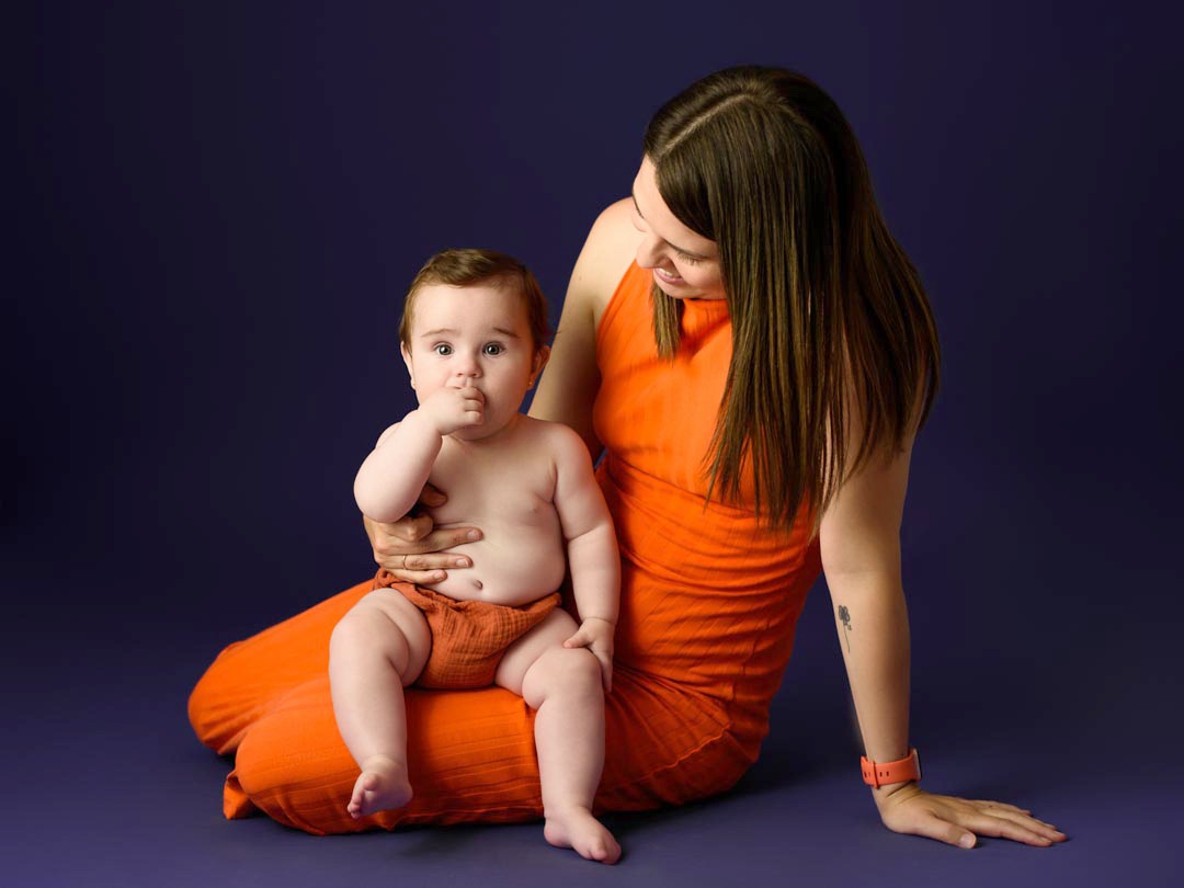 Para esta sesión, jugamos con la armonía entre el lila, el azul celeste y el naranja. La madre llevaba ropa en tonos naranjas, creando un contraste precioso con el fondo lila, mientras que en otras tomas utilizamos el azul celeste para aportar frescura y equilibrio visual. Elegir los colores de manera estratégica hacen que la sesión sea memorable.