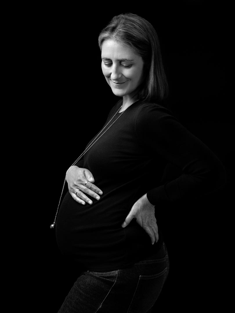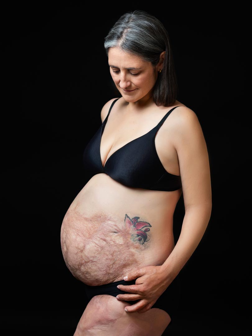 Durante la sesión, se trabajó con fondos negros y un manejo cuidadoso de la luz y las sombras. Esto permitió resaltar su silueta y transmitir la emoción del momento de manera natural y elegante. Cada fotografía cuenta algo auténtico y poderoso, respetando la identidad de la protagonista y la historia de su cuerpo.
